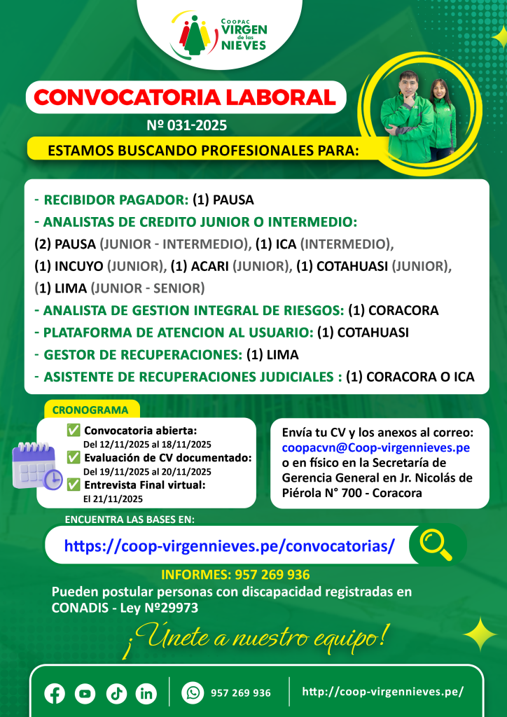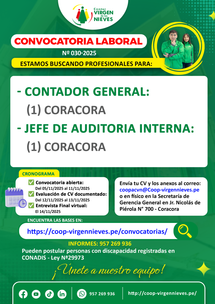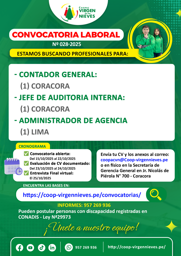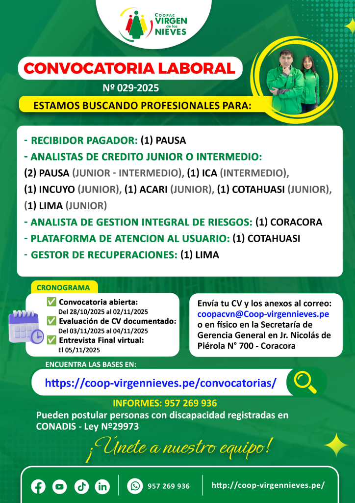 CONVOCATORIA II PARA LA CONTRATACIÓN DE GERENTE GENERAL DE LA COOPERATIVA DE AHORRO Y CRÉDITO “VIRGEN DE LAS NIEVES”